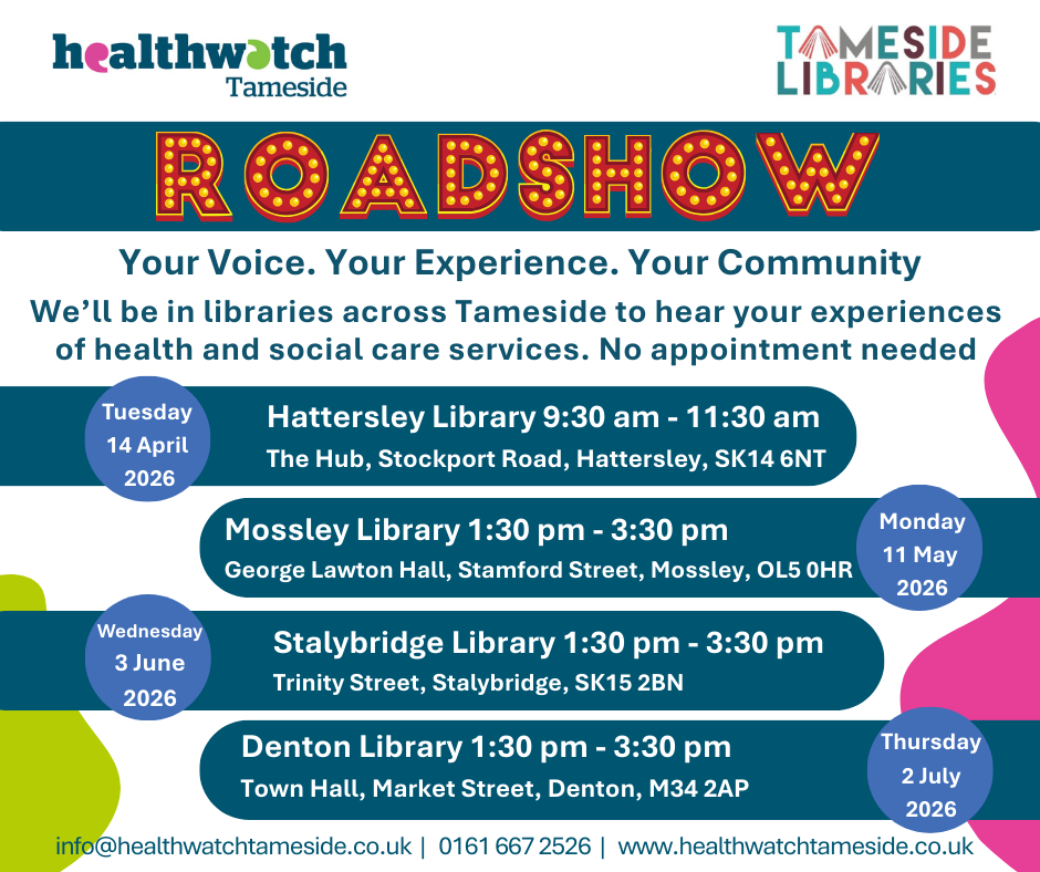 Throughout 2026, our team will be visiting every library in Tameside to hear directly from local people about their experiences of health and social care services. There’s no need to book, simply drop in, have a chat with us, and share what’s working well or what you think could be improved.